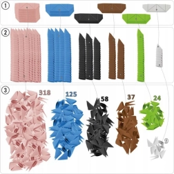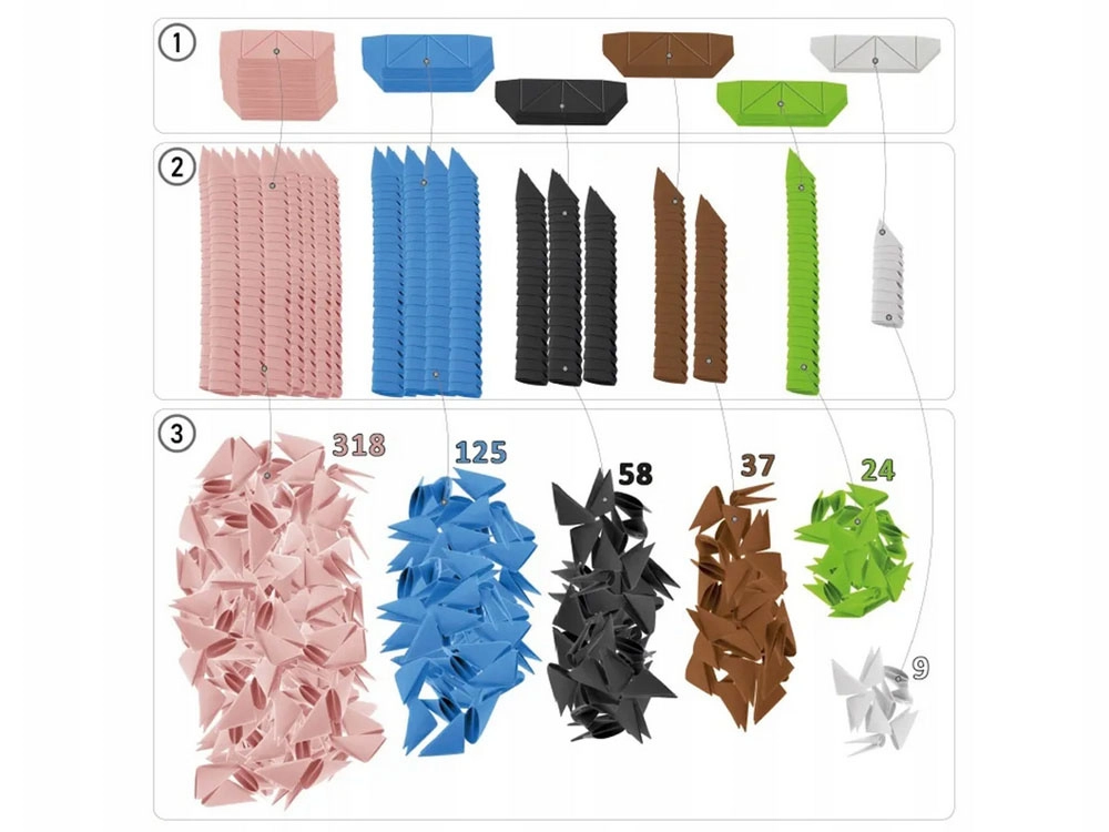 modules en papier, 2× pattes en papier de flamant, 2× tiges, 1× planche d’autocollants, 1× notice imprimée