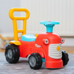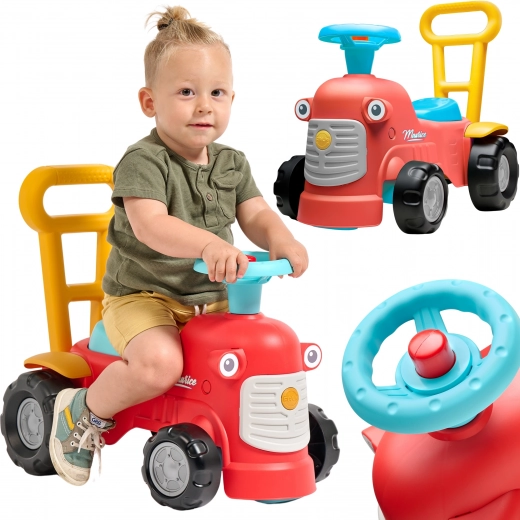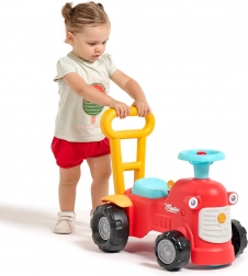 En se tenant derrière le tracteur, les enfants peuvent utiliser les poignées ergonomiques pour apprendre à marcher de manière ludique et sécurisée. Sous le siège, il y a un petit espace de rangement pour les trésors.
