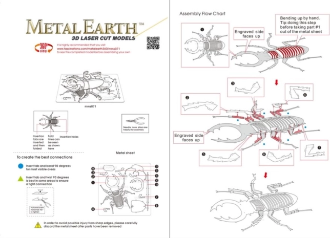 Retirez les pièces des plaques métalliques, en utilisant si nécessaire de petites pinces coupantes (non incluses). Les pièces s’assemblent à l’aide de verrous formés par une languette et un trou. Pliez la languette avec de petites pinces fines (non incluses) et assemblez progressivement tous les verrous jusqu’à obtenir une pièce maîtresse très réaliste !