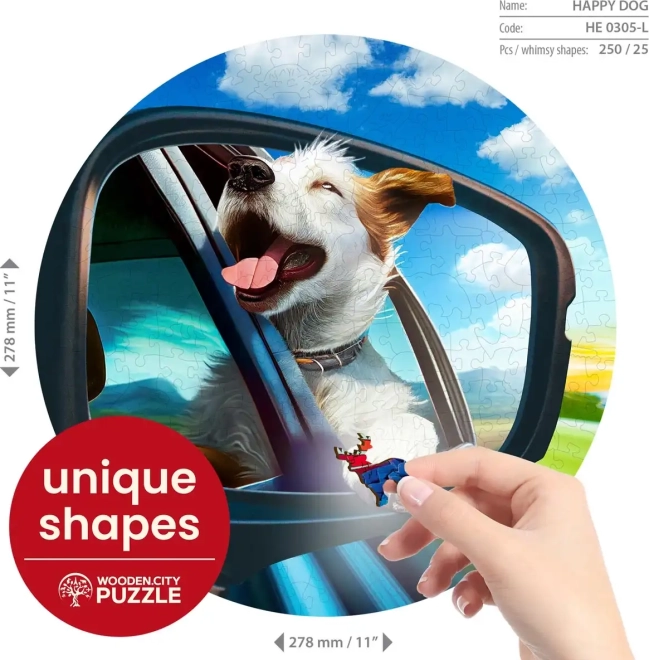 Puzzle en bois WOODEN CITY Chien joyeux, 250 pièces. Découpe laser, formes d’animaux uniques, bords lisses, HDF 3–4 mm, emballage éco sans plastique.