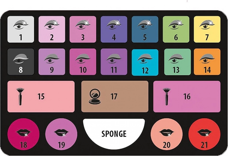 - Trousse de maquillage, palette de 14 fards à paupières, 2 types de blush, 1 poudre, 4 gloss pour les lèvres, 1 éponge, 1 pinceau, 3 applicateurs, lumière annulaire selfie LED avec trépied pliant, patins antidérapants, support pliant pour téléphone portable, support pour cartes et téléphone portable, cartes make‑up avec conseils et techniques, autocollants, mode d’emploi