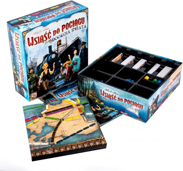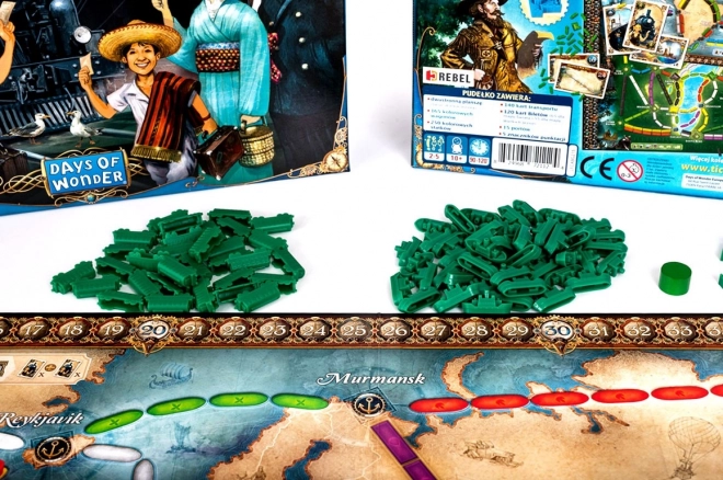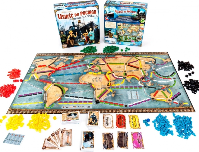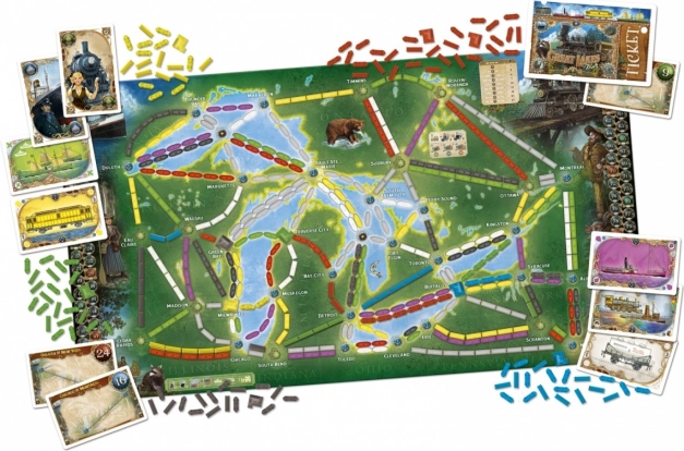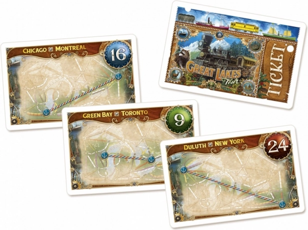 - Carte recto-verso (Monde / Grands Lacs), 165 wagons en plastique (33 chacun en cinq couleurs), 250 bateaux en plastique (50 de chaque couleur), 140 cartes transport (80 trains, 60 bateaux), 120 cartes billet (65 Monde, 55 Grands Lacs), 15 ports (3 de chaque couleur), 5 jetons de score