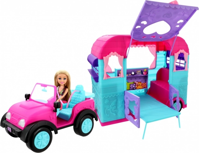 Ce set de jeu coloré apporte tout pour les petits voyageurs : un élégant jeep ouvert, attelé à une caravane décorée, et une poupée d’environ 26,5 cm. Les enfants profiteront d’heures de jeu imaginatif – des sorties dans la nature au camping sous les étoiles.