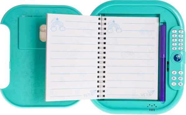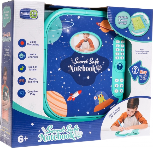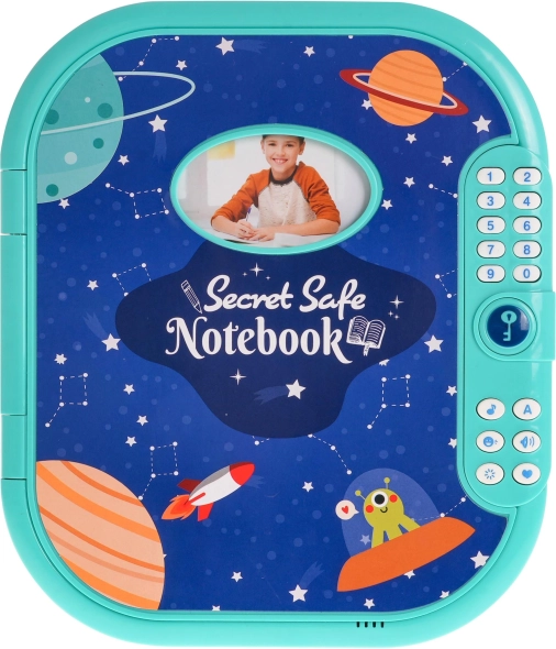 Journal secret pour enfants avec cadenas à code, offrant non seulement un espace pour conserver des notes importantes, mais aussi des fonctions ludiques et éducatives. Il présente un design coloré avec des planètes et des fusées et propose des options de personnalisation. Avant la première utilisation, il faut définir un mot de passe à quatre chiffres qui protège tous les secrets à l’intérieur.