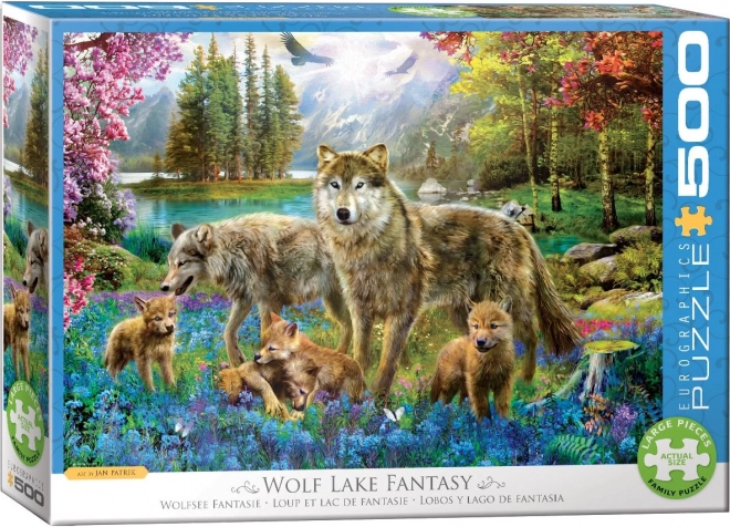 Puzzle EUROGRAPHICS Famille de loups au bord du lac, 500 pièces XL. Pièces extra grandes pour un assemblage facile, idéal pour enfants et seniors. Dimensions 67,63 × 48,89 cm.