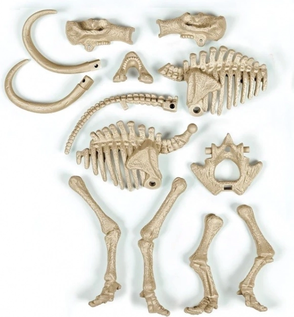 - Bloc de plâtre, marteau, burin, pièces du squelette de mammouth (phosphorescentes)