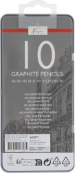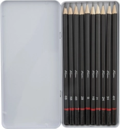 Le set de 10 crayons graphite couvre toute la plage utile pour la création : des tendres pour des ombres intenses et des traits expressifs aux durs pour des détails fins et des traits techniques. L’étui métallique fourni protège les crayons lors du transport et maintient l’ordre à l’atelier comme à l’école.