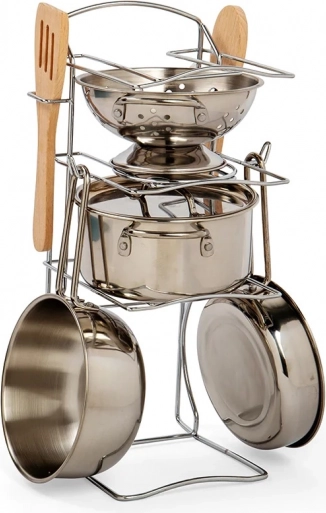 Stimulez l'imagination des enfants avec cet ensemble de vaisselle 8 pièces sur support. Comprend tout ce dont un petit chef a besoin - d'une passoire en acier à une cuillère en bois.