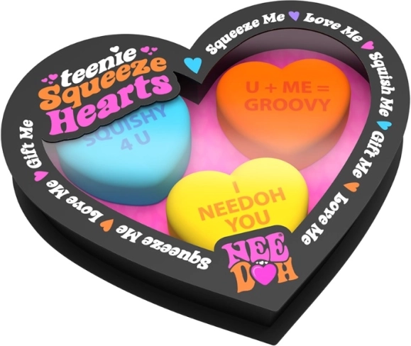 Libérez-vous du stress avec les cœurs antistress Schylling NeeDoh, parfaits pour se détendre et s’amuser. Chaque boîte contient trois cœurs aux couleurs aléatoires avec des citations motivantes.