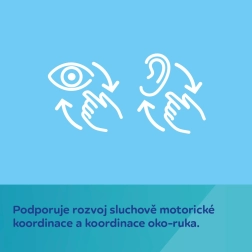 Les personnages en peluche avec éléments bruissants, sifflants et hochet favorisent le développement de la vue, de l’ouïe et de la coordination œil-main.