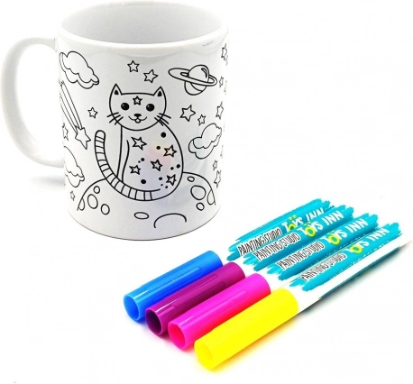 Cette tasse en céramique à colorier offre un divertissement créatif pour vos enfants. Elle est fournie avec quatre marqueurs de couleurs différentes.