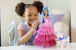 Célébrez le 65e anniversaire de BARBIE avec un coffret magique princesse et son alicorne ! La poupée, aux longs cheveux bleus, robe rose et ailes et queue amovibles, invite à un monde de fantaisie. Sont inclus un diadème avec corne, des boucles d’oreilles argentées, des chaussures stylées et une brosse pour coiffer. Un licorne ailée accompagne les histoires pleines de magie.