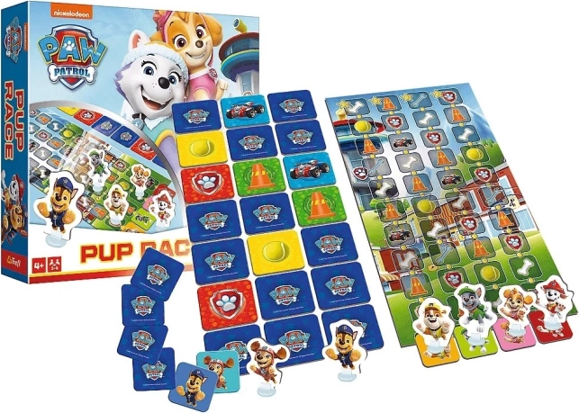 Jeu familial PAW PATROL : course des chiots. Exercez votre mémoire, trouvez les paires et arrivez le premier à l’arrivée. 2 variantes de jeu, règles simples, divertissement pour les enfants.
