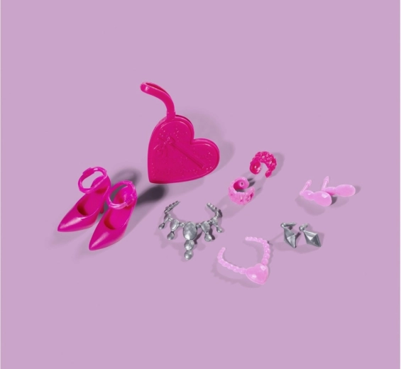 - Accessoires variés : 2 colliers, 2 paires de boucles d’oreilles, 2 bracelets, sac à main en forme de cœur, chaussures à talons.