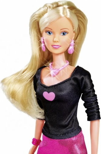 Steffi brille dans un haut noir élégant orné d’un cœur rose et une jupe rose pailletée – la combinaison parfaite pour tout défilé de mode.
