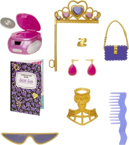 Cassie Cool séduit par sa tenue scintillante et ses cheveux violets saisissants. Le set comprend des lunettes, un sac à main, une couronne et d’autres pièces mode pour des combinaisons infinies.