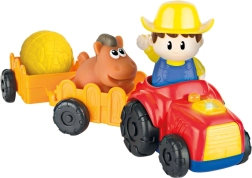 Tracteur avec remorque, fermier, petit cheval et botte de foin, qui joue et clignote. En appuyant sur le bouton, la lumière s’allume et vous entendrez des sons et mélodies amusants.