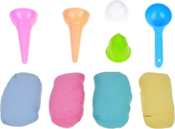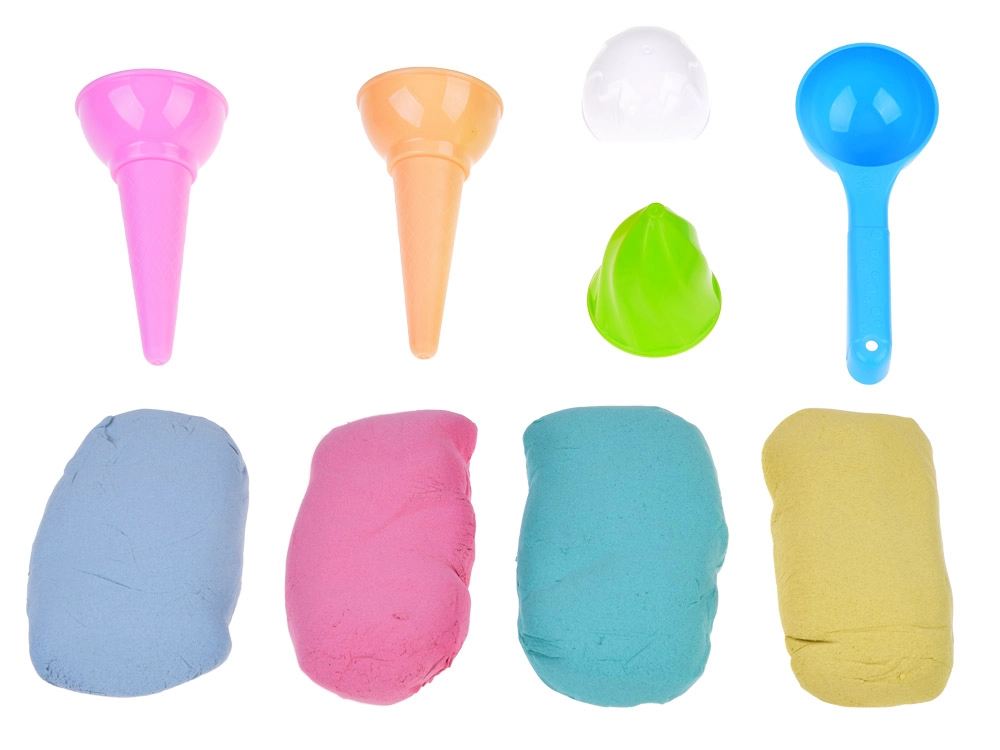 • Contenu de l’emballage : 4 × 70 g de sable (jaune, rose, vert, bleu), 2 cornets en plastique, 2 boules en plastique, cuillère à glace