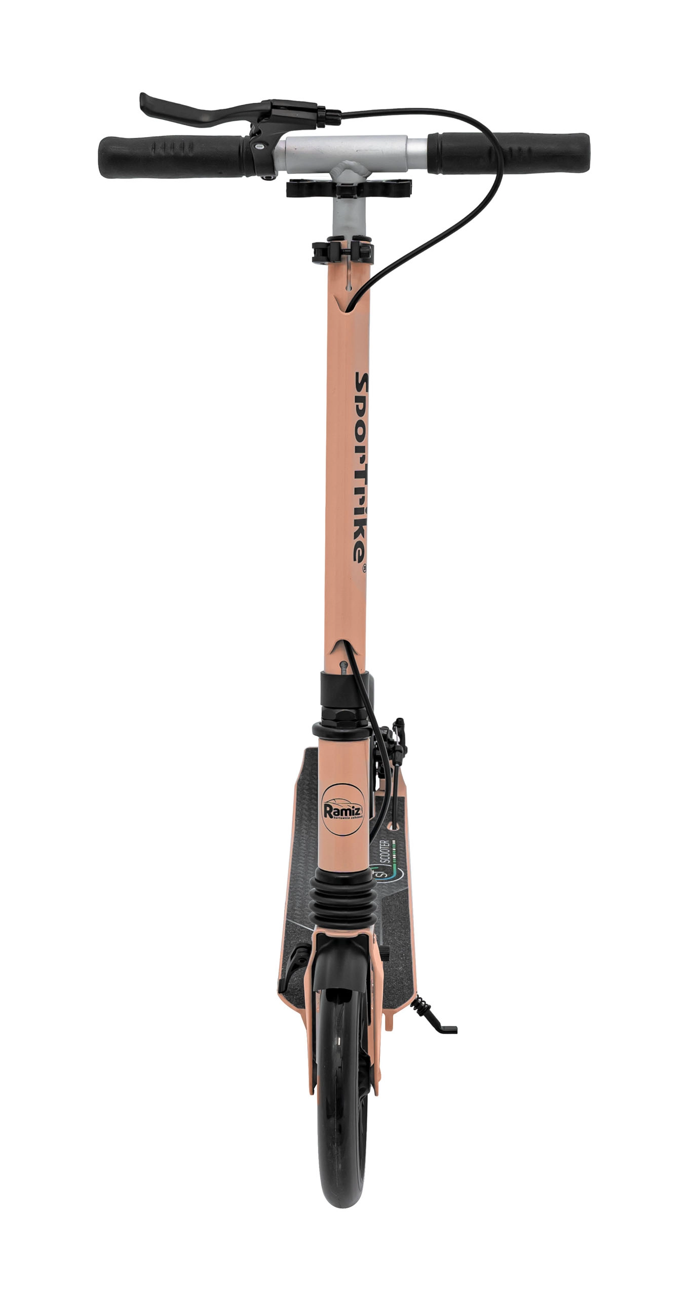 Trottinette urbaine stylée SporTrike avec cadre en aluminium léger, système de freinage double (frein à disque manuel + frein arrière à pied) et hauteur de guidon réglable pour une conduite confortable. Plateau antidérapant, roues en caoutchouc 190 mm et béquille pratique pour la sécurité, la stabilité et un stationnement facile.