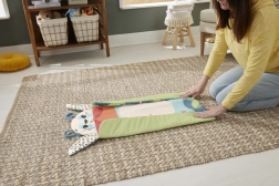 Le tapis est fabriqué avec un textile contenant 90 % de plastique recyclé et livré dans un emballage certifié FSC. Grâce à sa conception astucieuse, il se roule facilement, se fixe avec des « pattes » et vous accompagne partout. Les jouets amovibles se clipsent aisément sur les boucles, pour un jeu toujours renouvelé et stimulant.