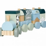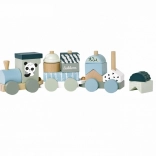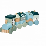 La locomotive et deux wagonnets munis de chevilles permettent aux enfants d’empiler et de réorganiser 13 blocs colorés aux formes et motifs variés – idéal pour développer l’imagination et la motricité fine.