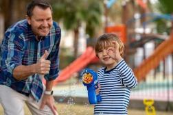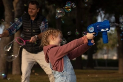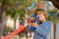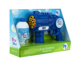 Le pistolet à bulles Fru Blu projette à grande vitesse une énorme quantité de bulles et offre des heures de divertissement à votre enfant. Les bulles sont éclairées par une LED qui met en valeur leurs couleurs uniques. Grâce à sa facilité d’utilisation et à son réservoir de liquide anti-renversement, souffler des bulles est une activité parfaite pour les plus jeunes comme pour les plus grands. Le set comprend un jouet lance-bulles et une bouteille de 0,4 litre de liquide. Piles requises : 3 x AA. Piles non incluses. Jouet adapté aux enfants de plus de 3 ans.