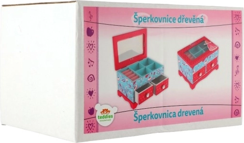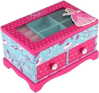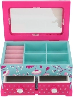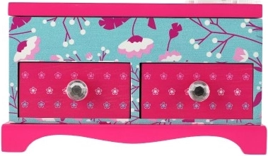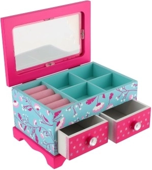 Élégante boîte à bijoux pour enfants en bois de qualité avec un couvercle rabattable et deux tiroirs, idéale pour ranger bijoux et petits trésors. Elle se distingue par un design coloré aux motifs floraux et d’oiseaux dans une combinaison rose et bleu, agrémenté d’un motif de princesse. Un agencement intérieur pratique et un petit miroir intégré facilitent l’usage quotidien dans la chambre d’enfant.