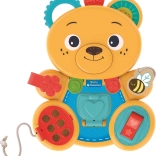 Un ourson ludique et coloré de la marque CLEMENTONI aide les enfants dès 12 mois à développer la motricité fine, la concentration et la perception sensorielle. Conçu selon la méthode Montessori, il propose une série d’activités telles que des œillets à enfiler avec lacet, un interrupteur à cliquer, un petit cœur à encastrer, une porte à ouvrir et une oreille à faire tourner. Il combine des éléments souples et rigides, y compris des composants en bois pour un développement riche et sécurisé.