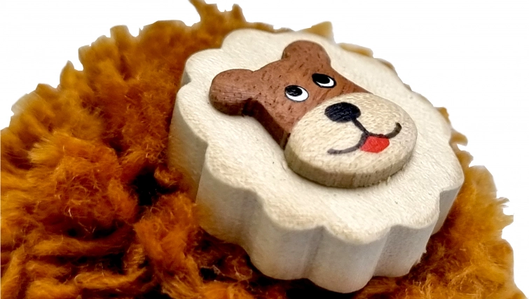 Cette décoration originale associe l’élégance du bois à la douceur d’un pompon en coton. Elle est fabriquée à la main avec jusqu’à cinq essences de bois – jacquier (Artocarpus heterophyllus), tamarinier de Manille (Tamarindus indica), cassier (Cassia fistula), aniba et gmelina arborea. Les couleurs sont naturelles, le bois n’est pas teinté ; l’aspect est sublimé par de fines retouches à la main. Le motif du lion ravira enfants et adultes et apportera une touche de caractère à tout intérieur.