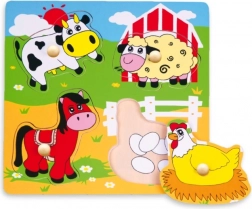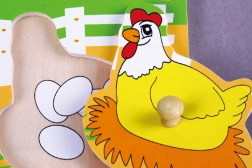 La vache, le mouton, le cheval et la poule aident les enfants à enrichir leur vocabulaire et à reconnaître formes et couleurs par le jeu.