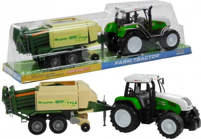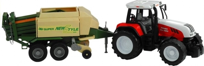 La remorque comprend des parties mobiles comme un support extensible, un mécanisme de ramassage rotatif et des volets latéraux et arrière ouvrants. Ce tracteur passionnant est disponible en rouge et vert, ce qui ajoute à l'authenticité et au plaisir.