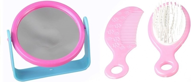 - Équipement complet : sèche-cheveux à piles, miroir sur support, brosse, peigne, 2 bigoudis, barrette nœud papillon, élastique à fleur, palette de fards à paupières, rouge à lèvres, bague avec cœur.
