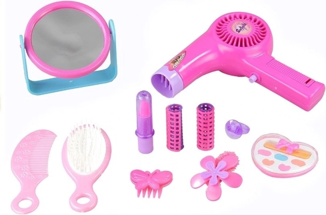 - Sèche-cheveux jouet à piles, miroir sur support, brosse, peigne, 2× bigoudis, barrette nœud papillon, élastique à fleur, palette de fards, rouge à lèvres, bague