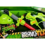 L’équipement de combat spatial se compose d’un pistolet et d’un sabre télescopique. Le schéma de couleurs de ces dispositifs défensifs est composé de teintes vives. Le masque inclus dans l’ensemble est conçu dans des tons vert et gris, possède une ouverture rectangulaire pour les yeux, des orifices au niveau de la bouche et un élastique à l’arrière pour maintenir le masque en place pendant le jeu.