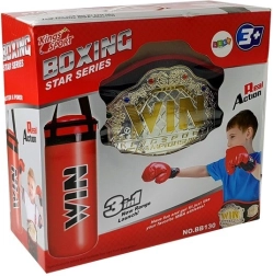 La victoire à l'entraînement ou lors d'un match amusant sera célébrée avec la ceinture de champion aux éléments dorés et aux pierres colorées. Des gants de boxe parfaitement ajustés sont également inclus.