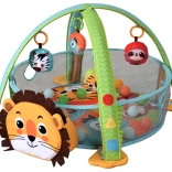 Tapis d’éveil éducatif moelleux en forme de lion offrant 3 modes d’utilisation – en tapis classique avec arches et jouets suspendus, en parc avec balles ou en combinaison des deux. Effets sonores et lumineux sur les arches pour favoriser le jeu et stimuler les sens. Couleurs vives et textures variées pour développer la vue et le toucher, tapis facile à nettoyer créant un espace sûr pour bébé dès la naissance.