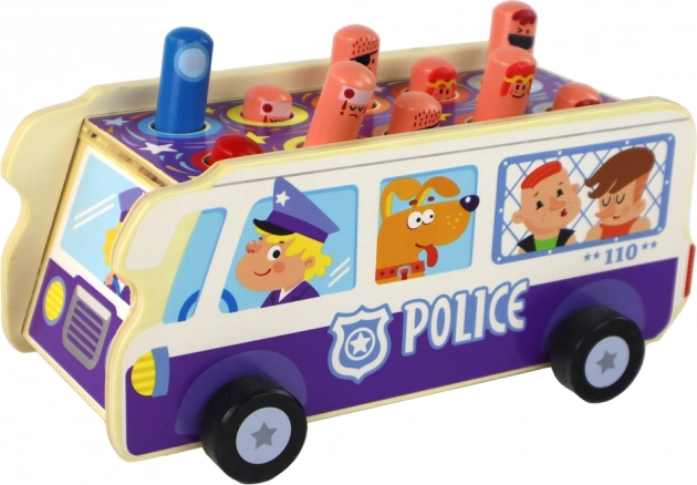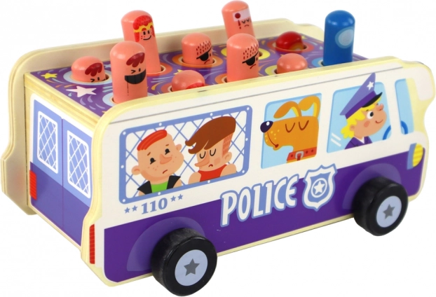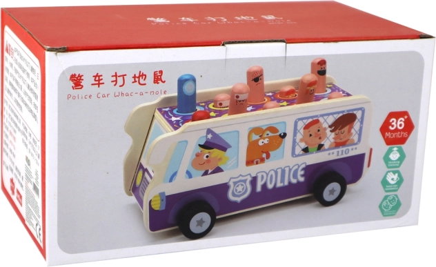 Amusant jeu d’adresse en bois en forme de bus de police qui développe la motricité fine, la coordination œil–main et les réflexes rapides. Les enfants « frappent » avec un petit marteau les personnages qui surgissent et, grâce aux roues, ils profitent aussi de la conduite du bus. Fabrication en bois de qualité, matériaux sûrs, certification CE et conformité à la norme EN71 pour un jeu serein.