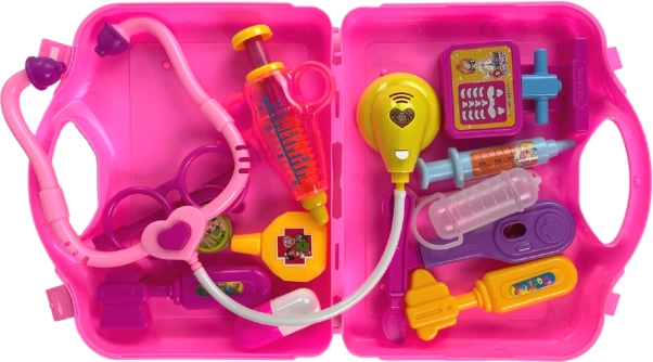 Adorable mallette médicale rose pour petits docteurs, offrant des heures de jeu créatif et d’apprentissage. Elle contient des instruments en plastique sûrs et un stéthoscope lumineux dont le petit cœur s’allume lorsqu’on l’approche. Les enfants exercent leur motricité fine, leur imaginaire et surmontent plus facilement la peur de la visite chez le médecin. Le tout est rangé dans une mallette portable pratique.