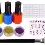 Décorez vos ongles à l’aide de divers autocollants à motifs et de paillettes en poudre dans trois couleurs éclatantes.