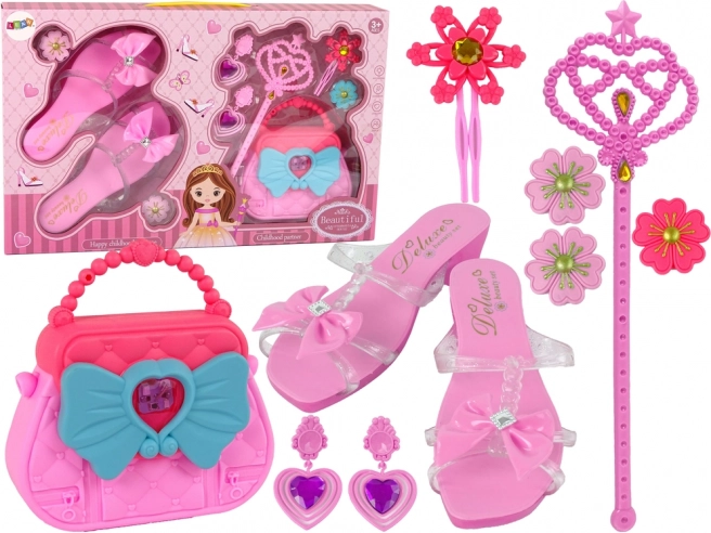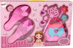 Ce charmant ensemble de beauté est spécialement conçu pour les petites filles qui aiment imiter leur maman et se déguiser en princesse. Il comprend une variété d'accessoires comme des mules, un sac à main, une baguette magique, des boucles d'oreilles à clip et des barrettes. Tous ces accessoires en rose et couleurs pastel sont ornés de pierres et de nœuds, enchantant chaque jeune passionnée de mode.