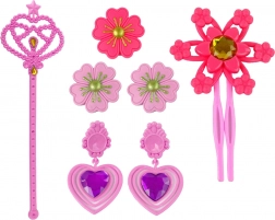 Comprend une baguette magique rose et d'autres jouets en plastique tels que barrettes, boucles d'oreilles et pinces à cheveux, tous charmants avec leur esthétique ludique et leurs motifs de cœurs et de fleurs.