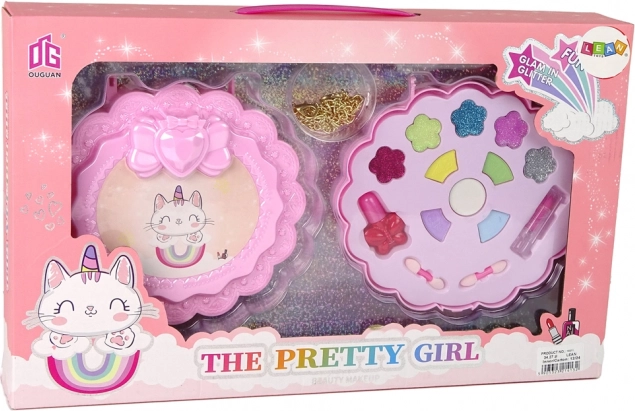 Ce set de beauté rose à motif licorne est idéal pour les enfants qui aiment expérimenter les couleurs et le look. Il contient des fards à paupières pour enfants, des paillettes, un rouge à lèvres rose, un vernis à ongles, des applicateurs en mousse et un collier doré – le tout conçu pour une utilisation sûre sur la peau sensible des enfants.