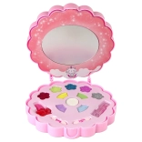 La palette enfant en forme de fleur avec miroir comprend des fards à paupières colorés et des paillettes, idéale pour un premier maquillage sûr et un jeu de rôle plein d’imagination.