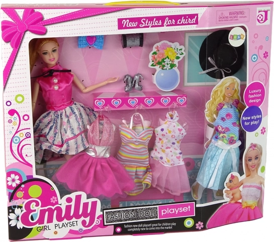 Poupée Emily, chaussures interchangeables, 4 robes, chapeau, 2 sacs à main