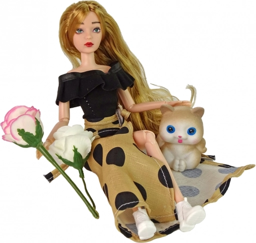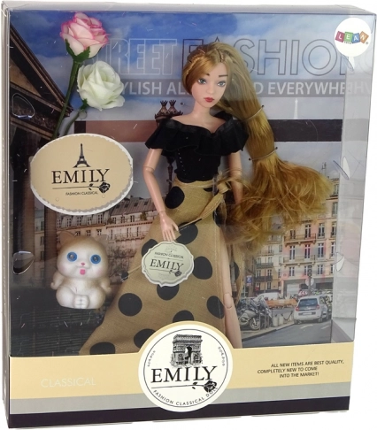 La poupée Emily porte une élégante blouse noire et une longue jupe beige à pois. Elle a de longs cheveux parfaits pour peigner et créer des coiffures, un visage peint de façon réaliste avec des yeux bleus et est entièrement positionnable grâce à ses articulations. Le coffret comprend également un adorable chaton et des roses décoratives qui enrichissent les histoires du quotidien et les jeux de rôle en famille.