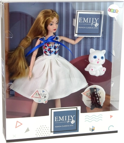Découvrez la poupée élégante EMILY avec de longs cheveux délicatement coiffés, un top moderne et une jupe blanche. Grâce aux bras et jambes articulés, les enfants peuvent facilement lui faire prendre différentes poses et créer leur propre défilé de mode. Un chaton blanc adorable complète chaque scénario de jeu.