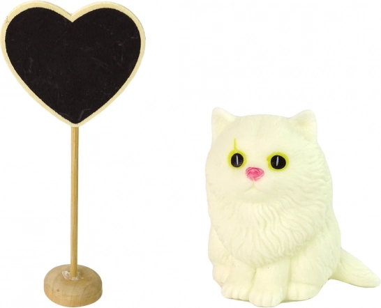 Le set comprend un chaton blanc avec sifflet pour de joyeux effets sonores, ainsi qu’un cœur décoratif en bois sur support, idéal comme décor pour la « scène » de jeu. Un excellent cadeau pour les jeunes amateurs de poupées et de mode.