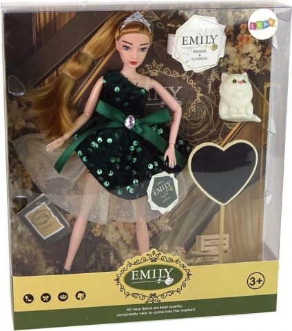 Insufflez de la magie au jeu des enfants avec la poupée Emily – une élégante poupée aux longs cheveux blonds, diadème doré et robe à paillettes vertes. Ses membres articulés permettent des poses naturelles et facilitent la mise en scène de défilés et d’histoires.
