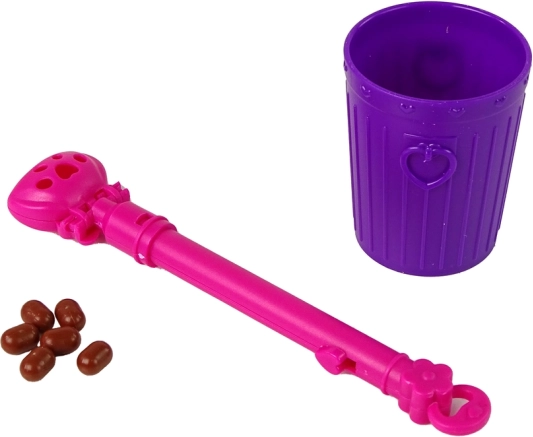 - Poupée, chiot, laisse rose, poubelle, gamelle avec nourriture, pelle