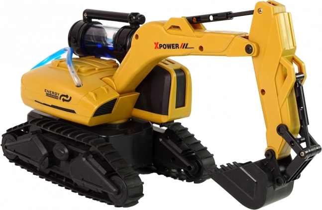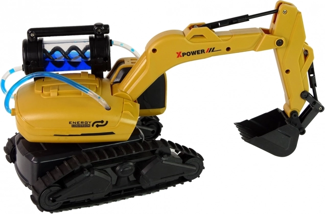 Les chenilles en caoutchouc assurent un déplacement stable et fluide sur diverses surfaces, tandis que les effets sonores et l’élément visuel avec liquide bleu sur la partie supérieure de la machine offrent une atmosphère authentique de chantier. La télécommande ergonomique tient bien même dans de petites mains.